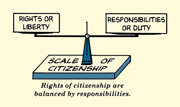For a few years, I was blessed to teach the basics of the Constitution to elementary school-age children during the annual Constitution Week, as required by education laws in Washington State. One of the most important interactions occurred when I had three or four children come up and hold some signs with the name of a “Right” on one side and the corresponding “Duty” on the other. Most of the children clearly understood about Rights, as children do – “I have the right to my room”, “I have the right to my toys”, “I have the right to eat”, etc., but Duties are harder — “I have the duty to keep my room clean, “I have the duty to take care of my toys”, I have the duty to help prepare meals or to wash the dishes.” In regard to the Constitution, we would talk about the Right to a Jury Trial, for example, and the subsequent Duty to Serve as a Juror. If you expect a good, intelligent jury to judge a case you might be involved in, then you have the Duty to be such a juror for someone else. Or perhaps, you want the Right to worship God according to your own conscience, then you have the Duty to allow others the same privilege. And so on . . .